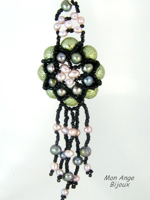 Aici, totul a pornit de la bratara, pentru care m-am inspirat dintr-un tutorial ce ma incantase de mult timp, ideea pandantivului venindu-mi pe parcursul lucrului! Am combinat perlele de sticla cu cele cultura si margelutele de nisip, asortand culorile intr-un mod deosebit, negrul margelutelor de nisip contrastand perfect si scotand in evidenta frumusetea modelului!