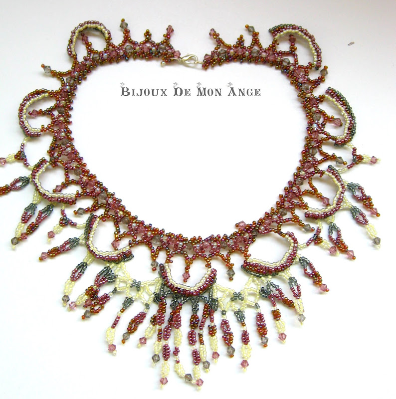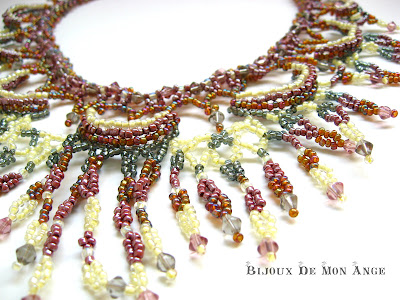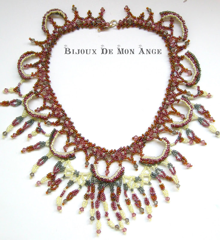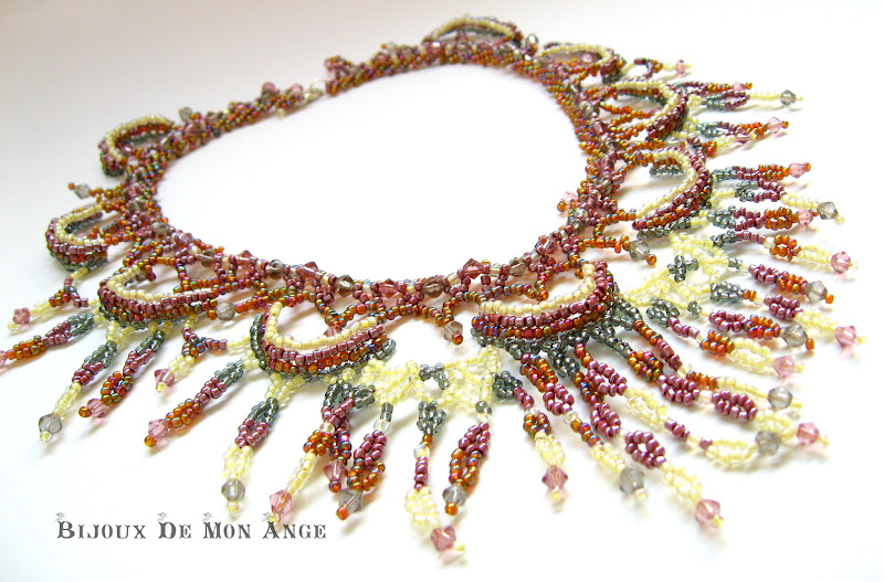 El este destul de complicat, pentru ca, pe langa faptul ca am folosit din nou combinatii de 5 culori (mov-maroniu cu irizatii, grena deschi sidefat, galben deschis, ametist si gri) impartite intre 2 tipuri de margele (biconice si margele de nisip), el cuprinde si mai multe tehnici de lucru: Saint Petersburg Chain ( lant saint petersburg), Netting (plasa), Square Stitch (tesut in pas patrat) si Fringe (franjuri).