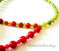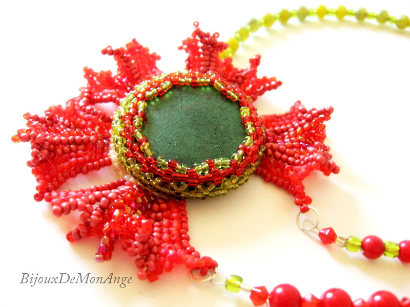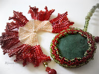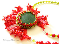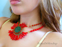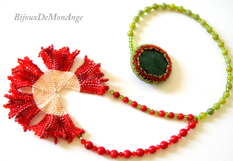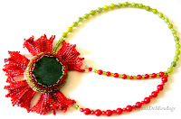 Primul din aceasta colectie este un colier in nuante superbe de rosu si verde, ce are ca piesa de rezistenta o floare tesuta din margelute mici ce serveste si drept "butoniera" pentru superbul nasture verde din colectia mostenita de la bunica, imbracat si el in margelute. Am innobilat acest colier si prin utilizarea pietrelor semipretioase de jad si de coral, dar si prin asimetria, atat a formei, cat si a culorilor, ce il face un aranjament perfect!