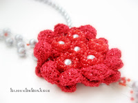 Floarea centrala este o brosa detasabila, crosetata din fir artistic metalic si imbogatita cu mici floricele din perle si margelute din sticla. Floarea este simbolul perfect al dragostei mature, decizia de a iubi fiind imbogatita de acele sentimente uneori nesigure, schimbatoare dar care o fac tot mai frumoasa si mai sigura :)