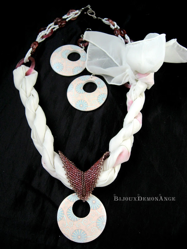 Materiale folosite: esarfa alba cu detalii fine roz, inele din sticla de Murano, margele din sticla crackle, margelute mici din sticla, pandantive din lemn pictat in culori delicate, accesorii metalice argintii.