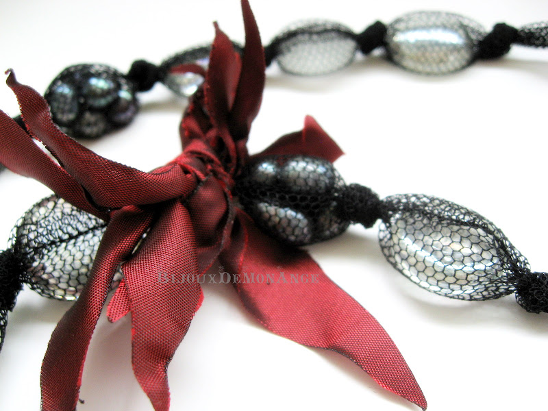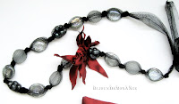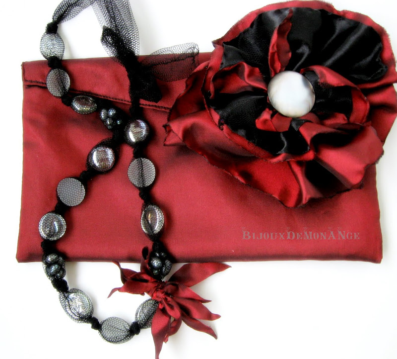 Posetei-plic i-am asortat un colier in ton, din tulle negru, "pietricele" din sticla si perle de cultura, intregite de o floare stilizata din tafta grena. Colierul se leaga intr-o funda.