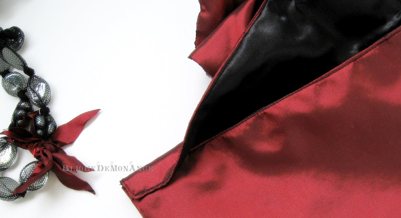 Poseta este realizata din tafta rosu-grena si captusita cu satin negru (dublate cu material intaritor), avand un model simplu (dimensiuni: 25x14.7cm), cu clapa asimetrica si fara inchizatoare - ma mai gandesc daca ii pun sau nu sistem de inchidere - modelul de la care am pornit m-a fermecat tocmai prin lipsa inchizatorii. Pentru a sta inchisa fara dificultate, am securizat prin coasere manuala in partea mai ingusta a clapei, iar floarea, fiind mai grea, mentine clapa in pozitia inchis.