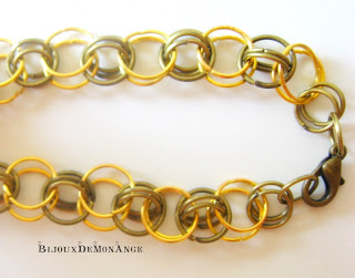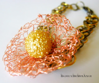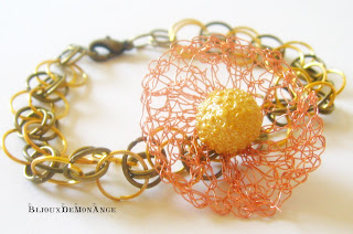 In ultima vreme, dupa cum am mai spus, am decis sa mai invat cate o tehnica de chainmaille (lucrul cu zalele). Am mai experimentat ceva, se numeste helm weave (helm= carma; weave=legatura, conectare) si am realizat o bratara, in 2 culori de zale (bronz si auriu). A iesit draguta insa prea banala, si am aruncat-o printr-o cutie. Si cum vreo 2 zile am crosetat multe flori din sarma ( printre care si cele pentru colierul Apus Violet In Gradina Cu Flori) mi-a venit geniala idee de a-i adauga o floare crosetata din sarma. Cea argintie nu mergea, cea aurie se pierdea, de cea colorata uitasem iar cea de cupru e geniala! Imi place la nebunie rezultatul, atat combinatiile de culori cat si combinatiile de tehnici.
