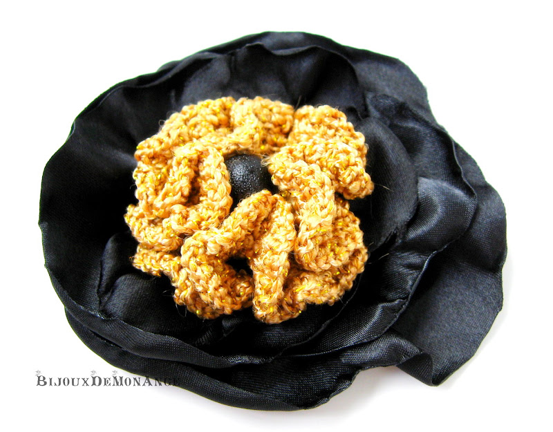 6. Golden black poppy - satin, floare crosetata din bumbac laminat, perla sticla, suport placat cu aur - 8.5 x 9.5 cm