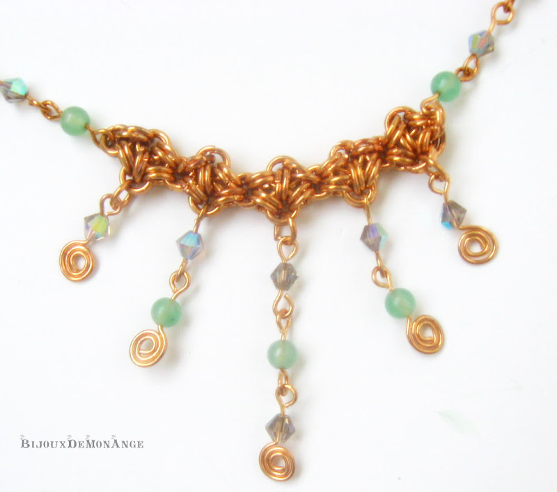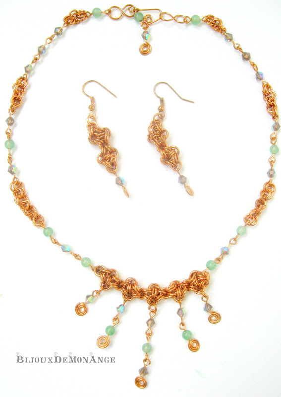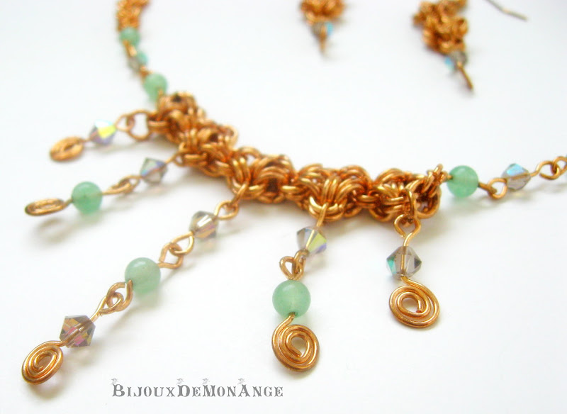 Intotdeauna m-au fascinat bijuteriile din zale, insa n-am avut curajul sa incerc ceva mai complex. Iata ca a venit si vremea aceea si am realizat un set superb din zale de un auriu roziu, combinate cu cristale swarowski si margele de aventurin verde.