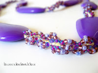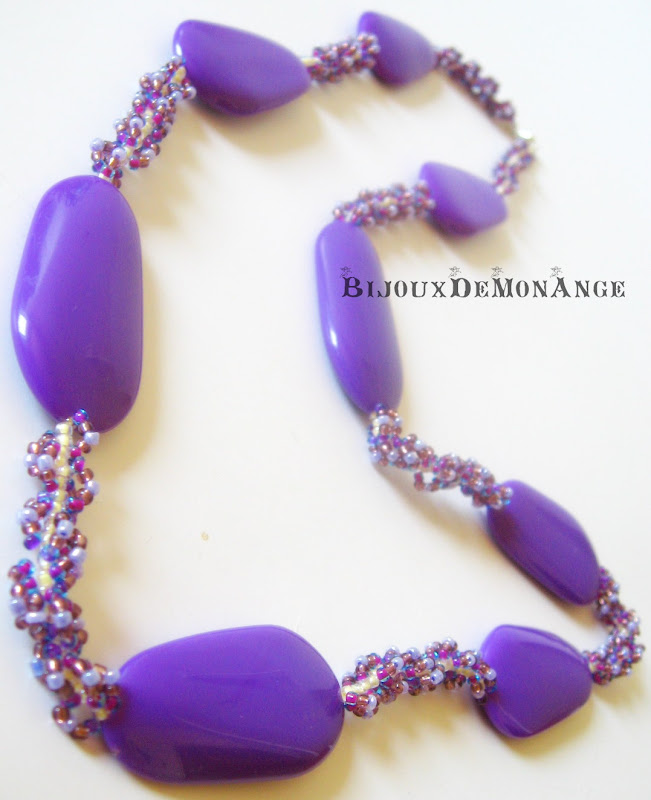 Plecand de la gandul ca trebuie si putin mov in colectie, am realizat acest colier din sute de margelute mici in nuante de violet, galben (culoare contrastanta), roz-albastru si margele mari acrilice de culoare mov.