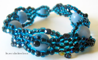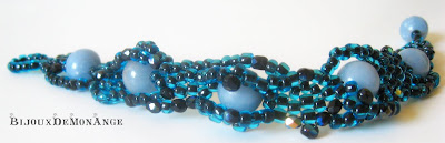 Am "impletit" margelute din sticla albastre cu miez negru, cristale de Bohemia negre cu irizatii albastrui-verzui si pietre semipretioase sferice de angelit.