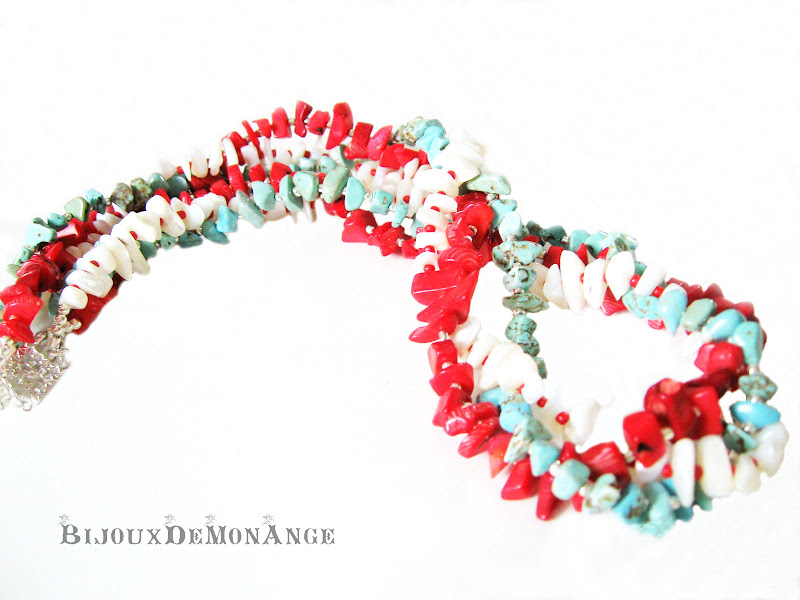 Iar cel de-al doilea este un colier tricolor,r ealizat din materiale ce amintesc de vara, mare, soare: sidef, turcoaz si coral! (mai multe despre el aflati aici)