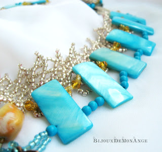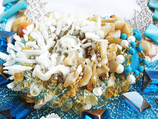 - used materials: seed beads, mother of pearl (chips, flat rectangule and round shape beads and sea horse pendant), natural shells, cultured pearls, citrine(chips), turquoise (dyed), aquamarine, quartz (a variety of), glass bicones, copper galvanized glass beads, copper charms, big shell clasp in nichel silver color (hand transformed)
