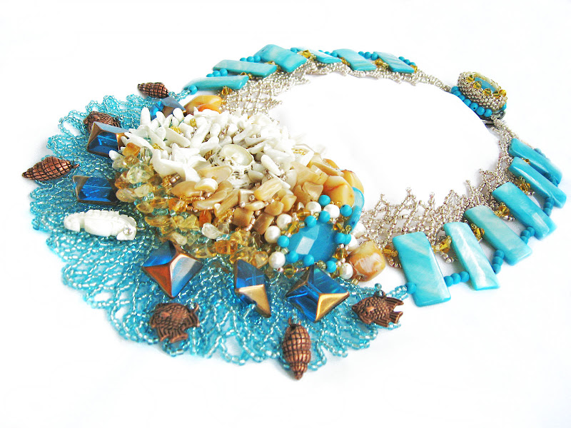 - brief beadwork description (optional): My project "Chaude Memoirs" is a tribute to a festival that will take place this weekend, named "Women on Matasari"! Matasari is a street in Bucharest, a place well known in the past (even in literature) as a notorius one, filled with easy women, pimps and drug dealers . Some people took the initiative to transform this place in one which promotes art and knowledge!! With this festival we show to the world that women have a lot of talents, abbilities and skills: singing, dancing, acting, literature, painting, fashion design, handmade artisanal skills and talents, cooking, fun games, and a lot of other stuff that women do and are good at! I will be a part of this festival, with my handmade skills and while working on this project I was thinking a lot to this event! The name, "Chaude Memoirs" (Hot memories), is chosen as a statement for this cause as a memory of the hot moments spent on the sea shore, maybe some hot nights (or days) walking hand in hand with the loved one, a refreshing bathe and game in the clear water, some full of stories footsteps left behind, the special moments looking for beauiful shells and the inimaginable feeling when finding a little seahorse, so gentle and scared, and then setting him free again! There are so many memories related to the seashore or, better said, to the seaside which is as LIFE, so many memories that a lot of women don't have ( with fate chosen mostly by others), so many feelings of love, trust, security, dreaming, hope, laugh, happiness! Most women taste only the salted immerse of the sea, not knowing even how to swim and yet how real life tastes! I choose to state for the beauty and life in it! But yet, a lot of women don't have this choice!
