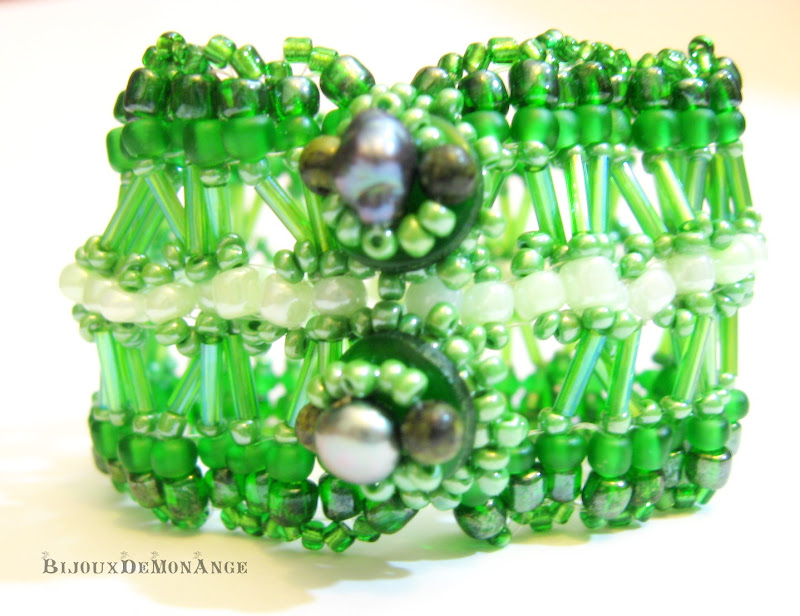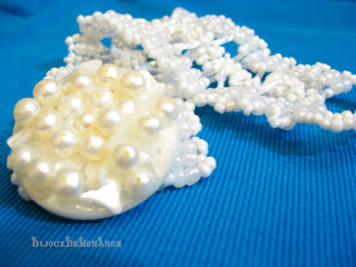 E pur si simplu de vis modelul acesta pe alb!! Iar cu partea centrala (inchizatoarea) e nemaipomenita!!! Am folosit un nasture mare, pe care am lipit chips-uri din sidef si perle!! Minunat!! Si, va promit o ... intregire! Va avea si colier! :p