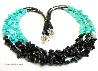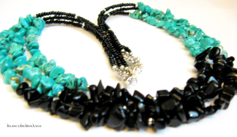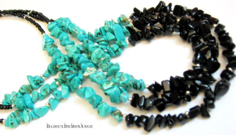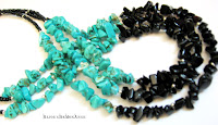 In aceasta seara, am reusit sa incropesc rapid ceva! Colierul pe 3 siraguri cu chipsuri si margelute de nisip este un model care mie imi place foarte mult! Insirand multele pungute cu chips-uri, mi-au sarit acestea doua in ochi: turcoazul este vopsit intr-o culoare superba iar combinat cu negrul onixului este de vis!!