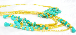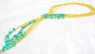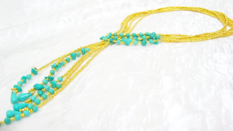 E un colier superb, tip lasou, realizat practic din 3 coliere mai mici :p din margele de nisip si margele de turcoaz (rotunde si cipsuri pentru un plus de textura)